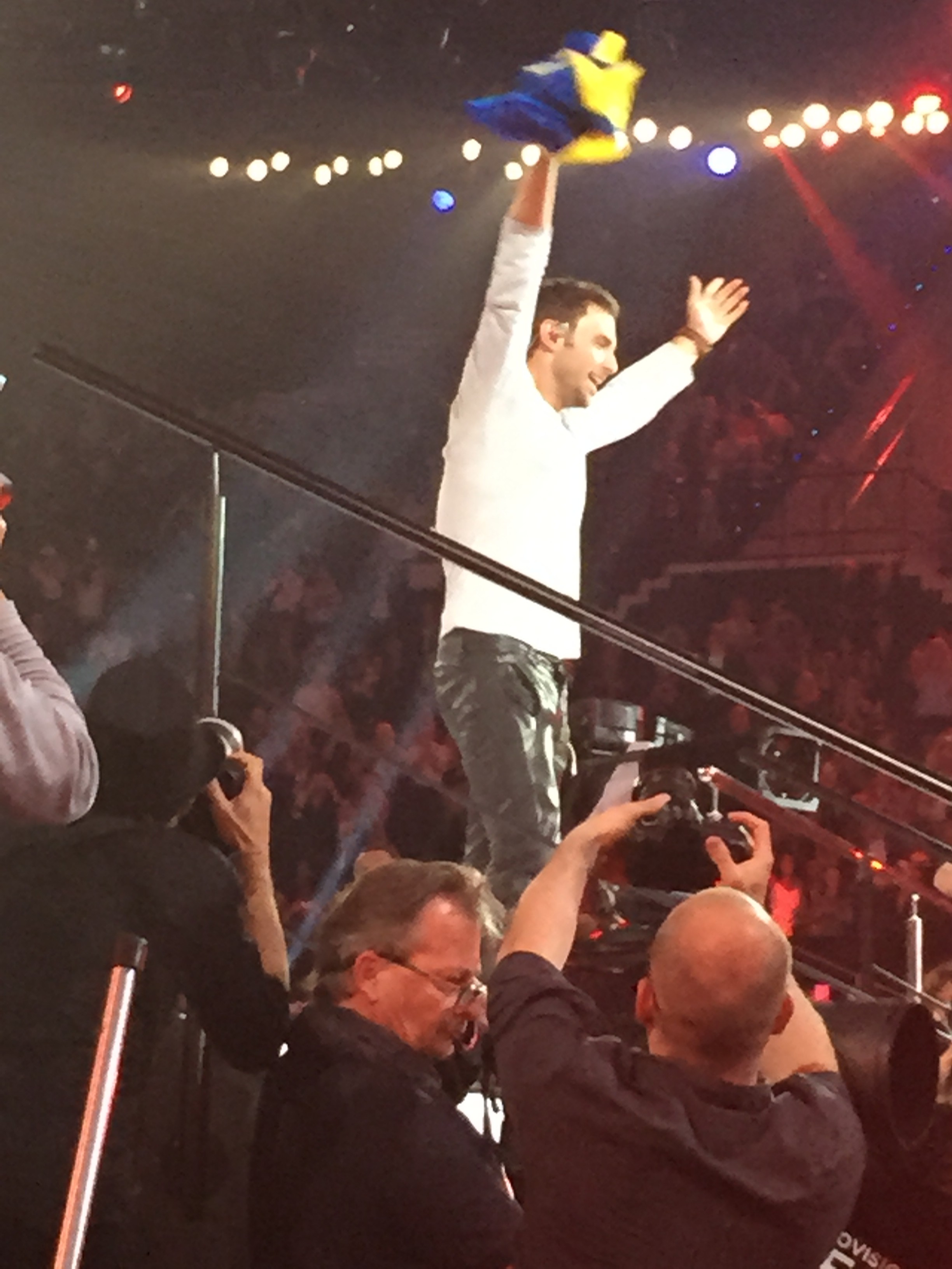 La segunda parte de las votaciones el arena se volvio 100% sueco. No sé si en televisión se escuchaba cuando todo el mundo celebraba que Mans tuviera más puntos que Rusia, y cuando llegaba el 12 todo el mundo gritaba «Sweden! Sweden!» Por un momento, los allí presentes nos preguntábamos… ¿Y si nos toca ir a Rusia y encender el Grindr allí?